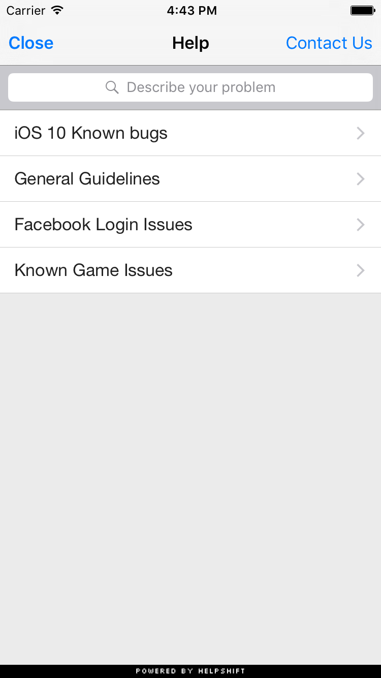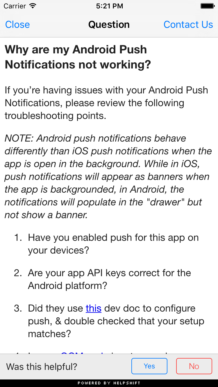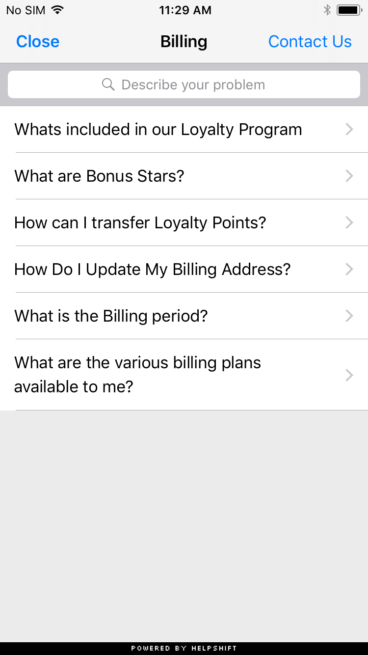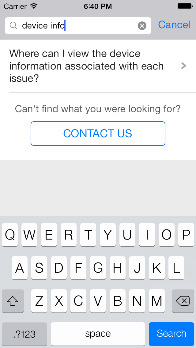 You can wire this API call to a "Help" or "Support" action in your app. This Activity combines the FAQ, Search and Contact Us functionality together in a single interface. In this view a user has to search for a specific question in the FAQ failing which they can report an issue. When you respond back to their question from the Helpshift Agent Dashboard, the reply will be shown as a count besides Contact Us, clicking on which will open up the conversation.