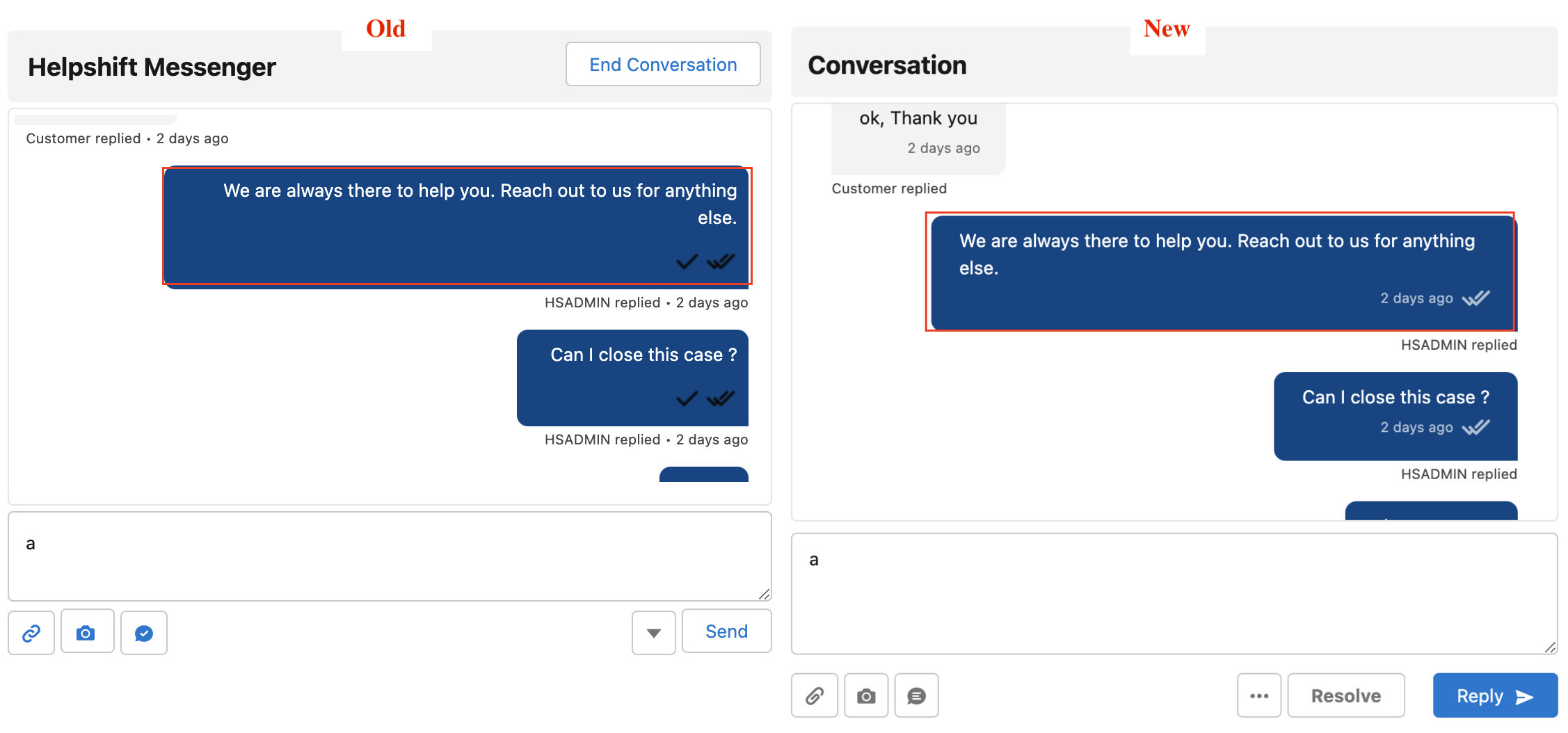 - The old experience will be available too. If the new messenger or any admin functionality doesn’t work as per your expectations, or you do not like the new experience, you can switch back to the old experience. Please provide feedback to Helpshift Support on reasons to switch back.
